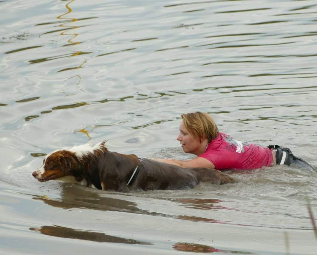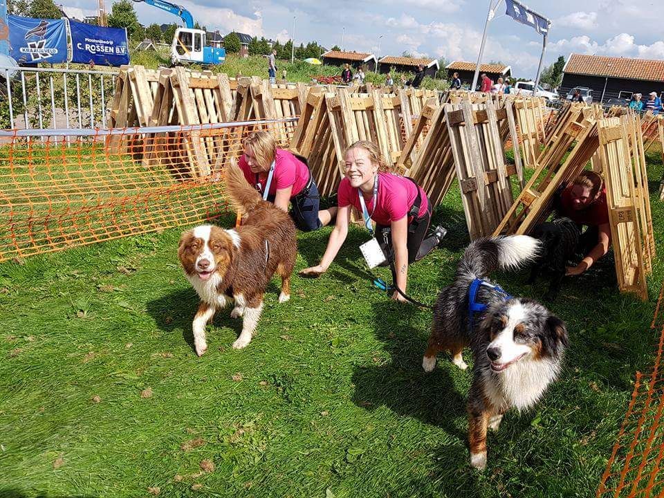 Om het heel kort uit te leggen: Het is een obstacle-run, of survivalrun, maar dan samen met je hond. Australian Shepherds zijn over het algemeen heel erg op de mens gericht. Ze willen heel graag voor jou, of samen met jou werken. Dogsurvival is éen van de vele sporten die je samen met je hond kunt gaan doen. Je rent of wandelt samen met je viervoeter over een parcours van ongeveer 5 kilometer en onderweg kom je allerlei obstakels en hindernissen tegen. Je moet dan samen ergens overheen klimmen of onderdoor kruipen. Ook kom je vaak veel waterpartijen (sloten etc.) tegen, met uiteraard de bijbehorende modder, waar je al zwemmend, lopend of met een Sup het parcours vervolgt.